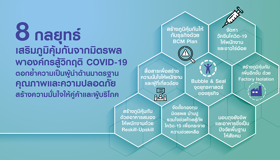 4. สร้างภูมิคุ้มกันให้จุดยุทธศาสตร์ของธุรกิจ เพื่อให้โรงงานสามารถดำเนินงานได้ต่อเนื่อง ด้วยการสร้าง Bubble & Seal เป็นชั้นๆ แบ่งกลุ่มพนักงานที่ปฏิบัติงานอยู่ภายในโรงงานออกเป็นกลุ่มย่อยๆ กลุ่มเล็กๆ ไม่มีการพบกันระหว่างกลุ่มหรือกะ เพื่อช่วยป้องกันบุคคลากรของเราไม่ให้ติดเชื้อ และเพื่อให้มั่นใจว่าการผลิตของเรายังคงเดินหน้าได้อย่างต่อเนื่อง นอกจากนี้ ยังมีการตรวจคัดกรองพนักงานด้วย Rapid Antigen Test Kit เป็นระยะ